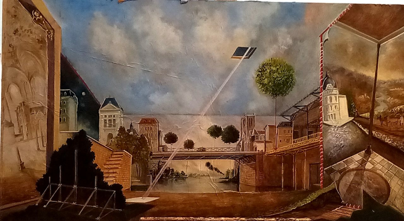 Ce tableau est la maquette d'une peinture murale peinte en 1986 sur un concessionnaire automobile qui était situé du côté des quais de la Marne, dans le centre-ville de Meaux. En décembre 2007 le bâtiment et la peinture murale qui s'y trouvait furent démolis, remplacés par un supermarché de proximité. Reste cette maquette, conservée de nos jours chez un collectionneur privé. |