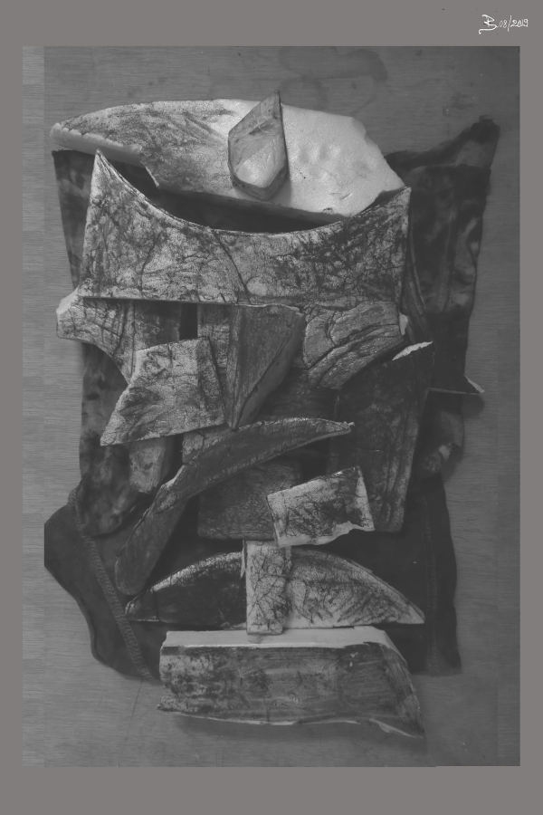 Photographie d'un assemblage de matériaux occupant une surface de 26 x 34 cm. Développement numérique au format 1365 x 2048 px |