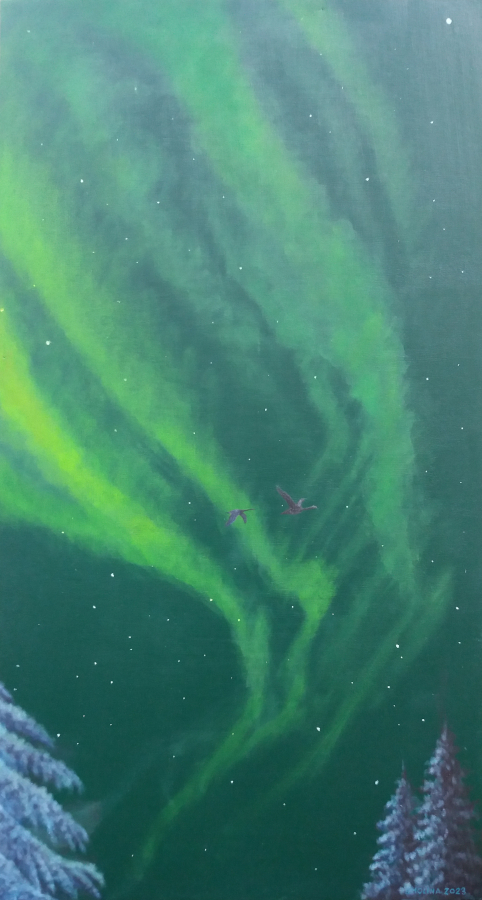 Cygnes et aurore boréale